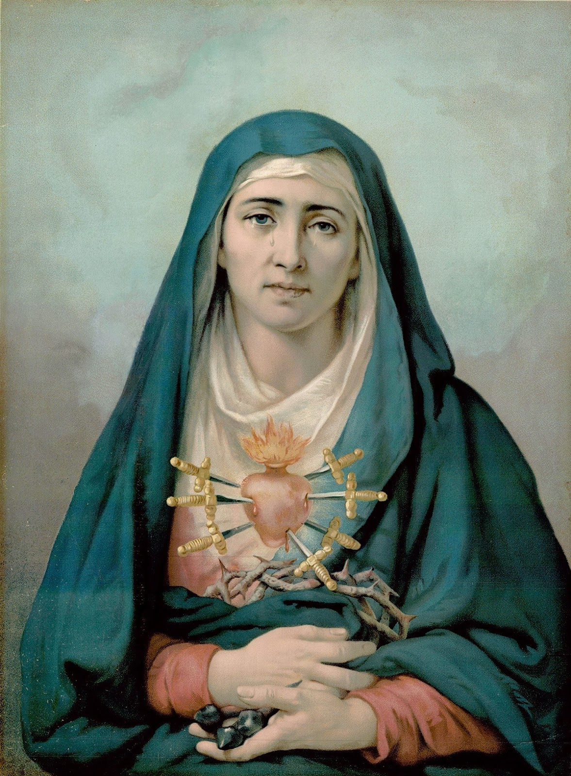 - El Corazón Traspasado: Siete espadas que representan sus dolores, recordándonos que su sacrificio fue una participación activa en la redención de la humanidad.